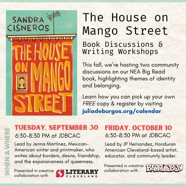 Join us for our Fall 2025 Book Discussions & Writing Workshops inspired by The House on Mango Street by Sandra Cisneros. These sessions will feature different facilitators depending on the program. Facilitators include our JDBCAC Book Club organizer Nahomy Ortiz-García, community partners such as Literary Cleveland, and guest artists like poet Jenna Martínez and writer JP Hernandez ‘BarrioBoy’.
